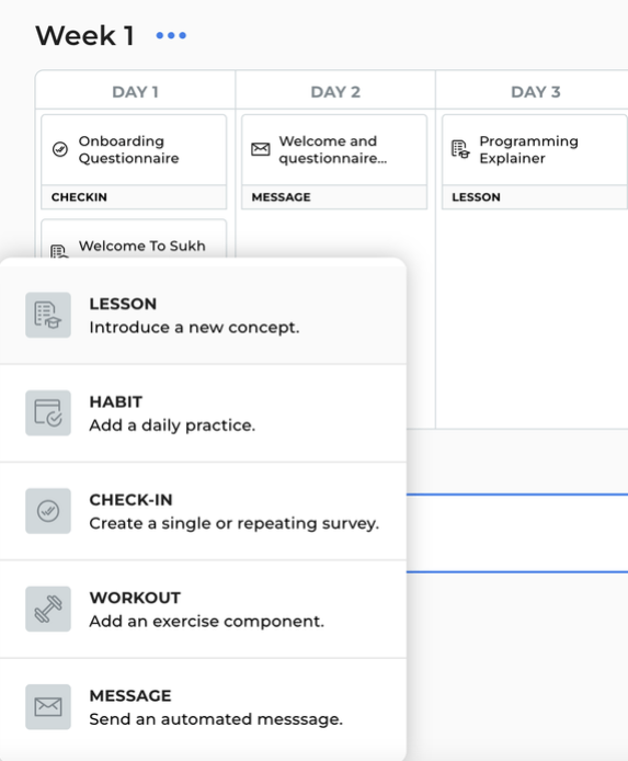 Inside the builder you can embed/upload videos, create forms (such as a PAR-Q, health screening, take measurements), send messages…